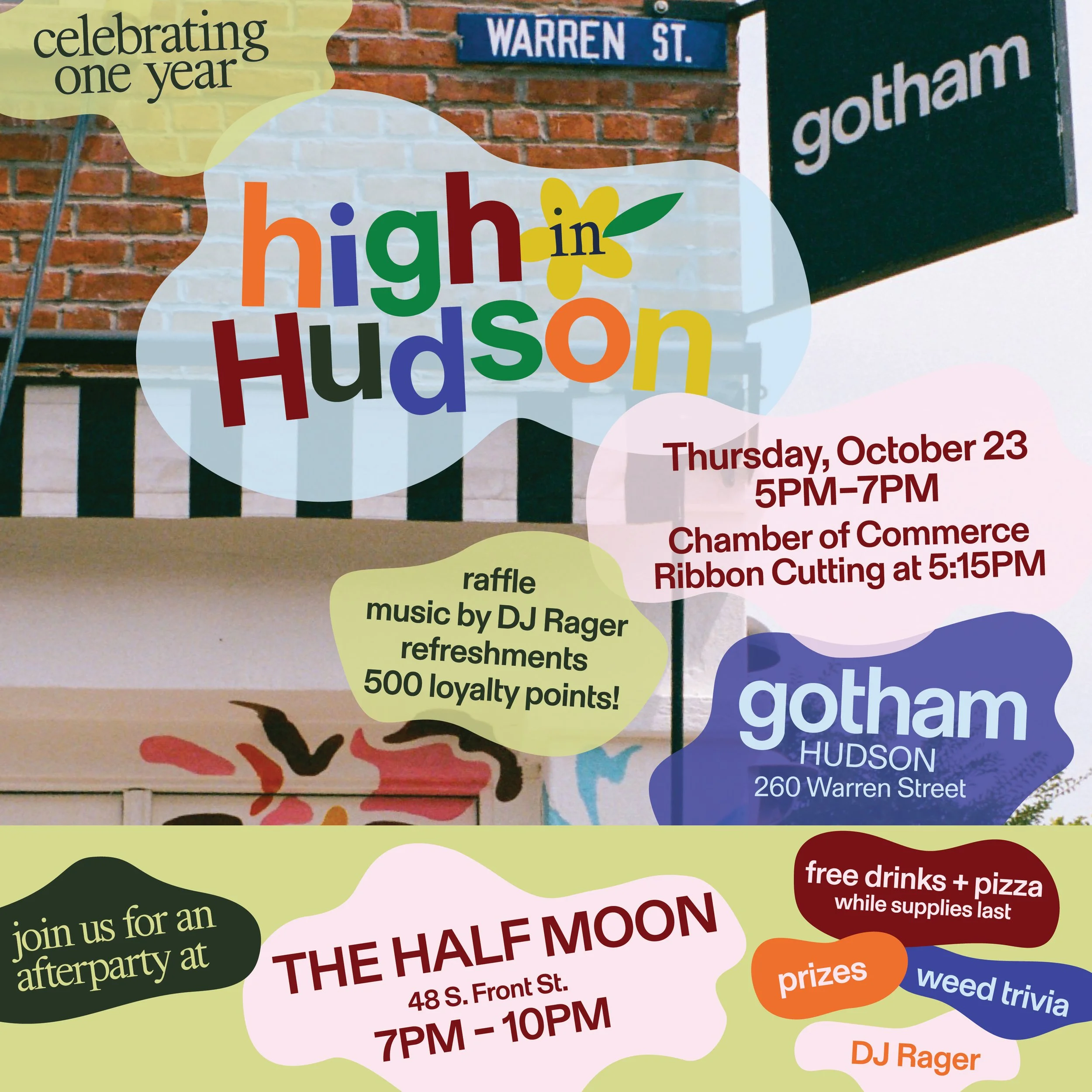 Please join us in congratulating the team at Gotham on this milestone. We'll begin at Gotham on Warren Street from 5-7 PM for refreshments, music, a raffle, and our ribbon-cutting. Gotham will extend the fun with an after party from 7-10 PM at The Half Moon with pizza and drinks, a set from local legend DJ Rager, and more. Come right at 7 to hop on the Gotham tab for free drinks and pizza—while it lasts!